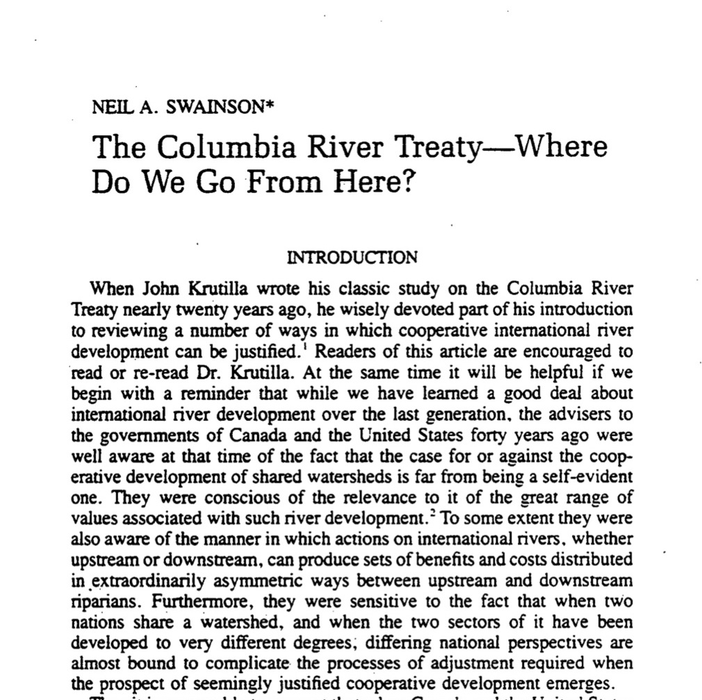 “September, 1964, marked the culmination of a major effort at international cooperation. At that time the United States and Canada ratified the Columbia River Treaty, which provided for joint development of the Columbia River Basin. The two countries . . .
