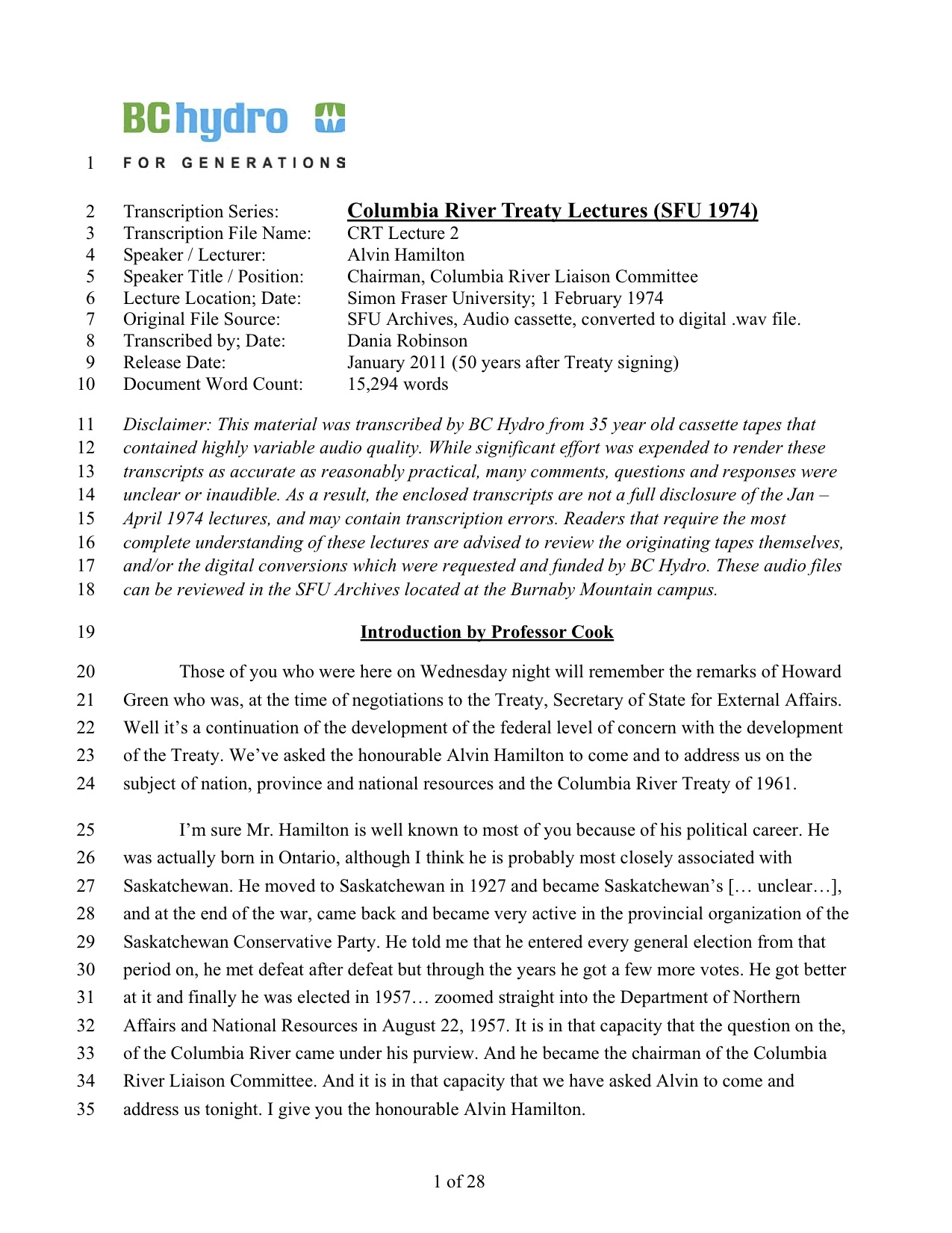 This second lecture in the 1974 series at Simon Fraser University features Alvin Hamilton, who had served as Chairman of the Columbia River Liaison Committee. He discusses Treaty negotiations, including the costs and benefits to Canada and British . . .
