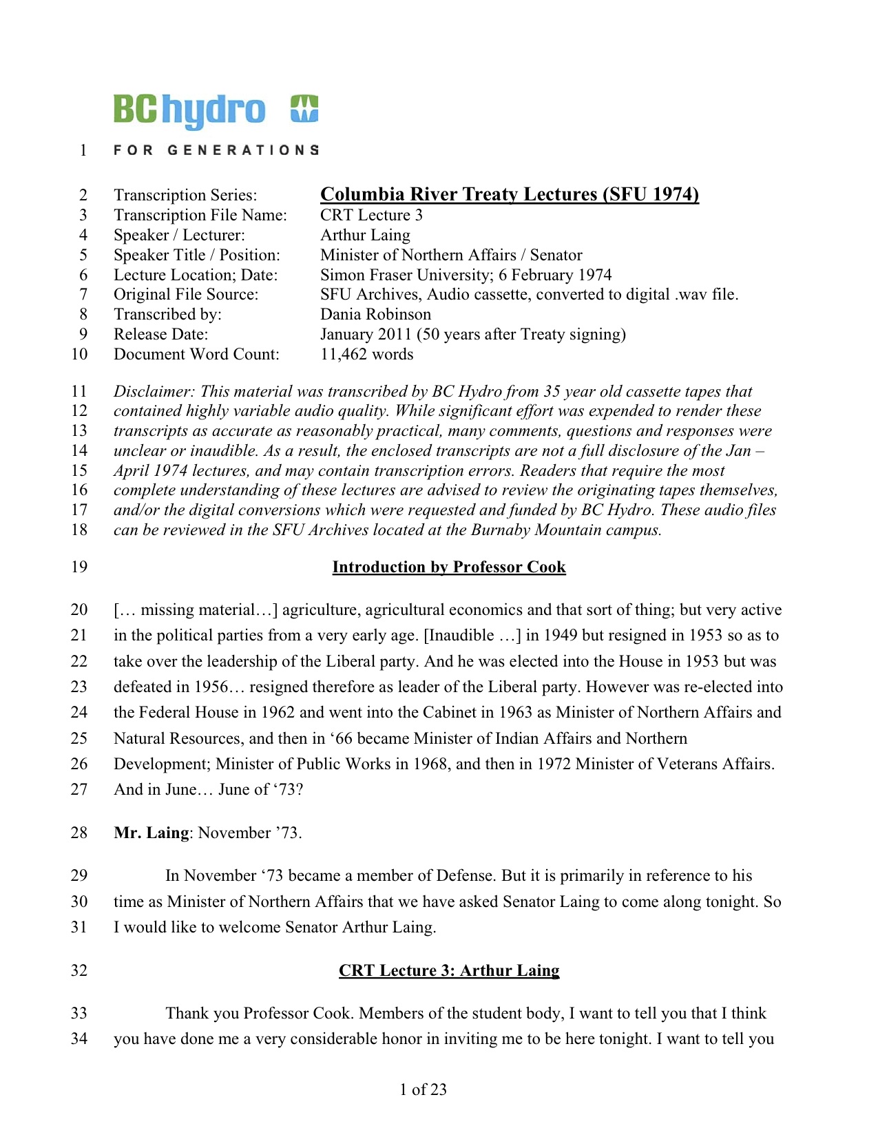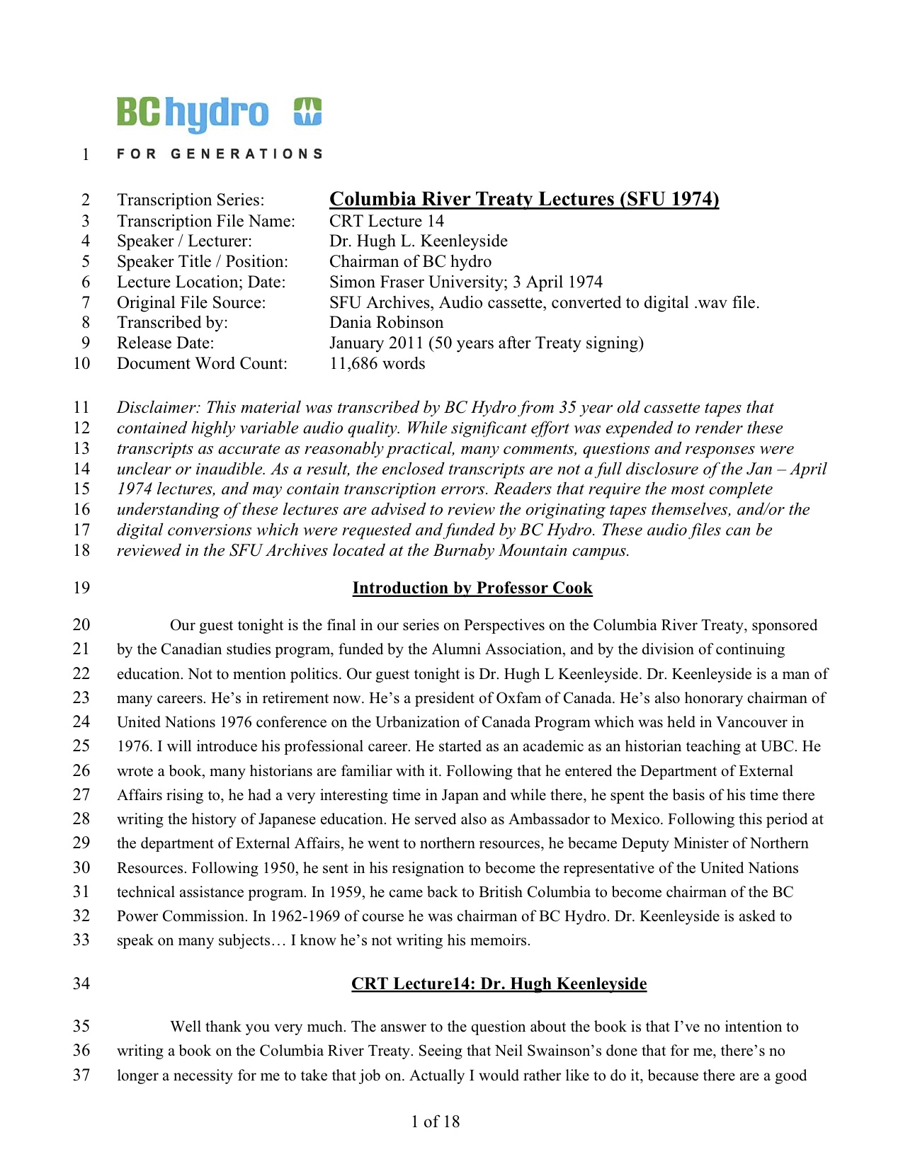 This final lecture in the 1974 series at Simon Fraser University features Dr. Hugh L. Keenleyside, Chairman of BC Hydro from 1962 to 1969. He discusses his involvement in the 1961 Treaty negotiations. Also includes a question-and-answer period with . . .