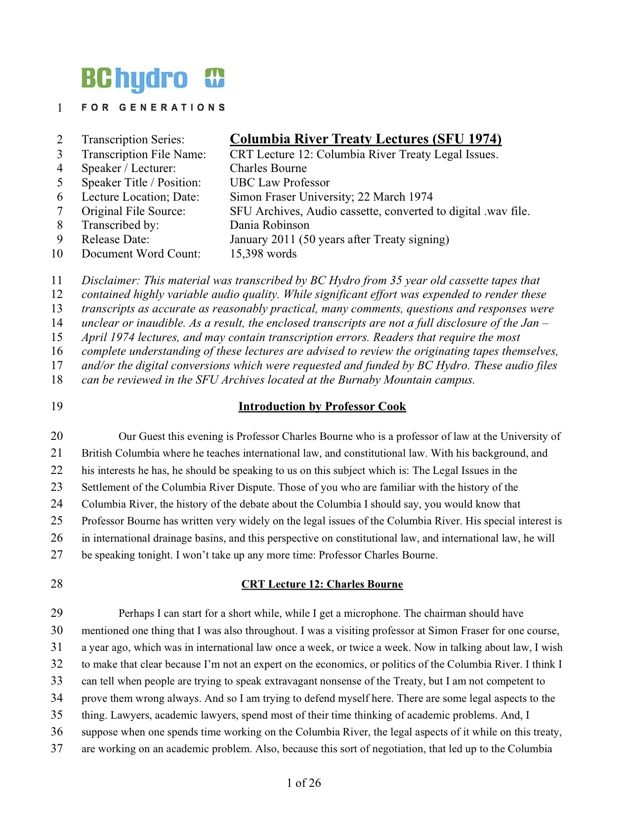 This twelfth lecture in the 1974 series at Simon Fraser University features UBC Law Professor Charles Bourne speaking on the subject, “The Legal Issues in the Settlement of the Columbia River Dispute.” He focuses on the legal background to the . . .
