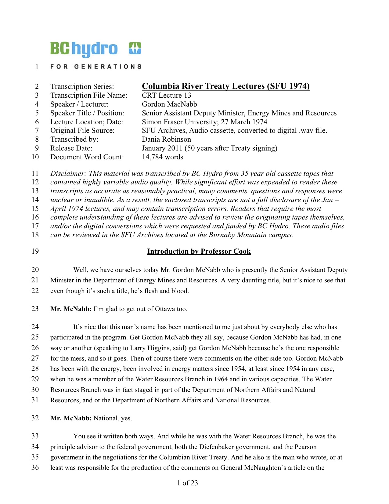 This thirteenth lecture in the 1974 series at Simon Fraser University features Gordon MacNabb, Senior Assistant Deputy Minister, Energy Mines and Resources and chairman of the Canadian section of the Permanent Engineering Board. Also includes a . . .